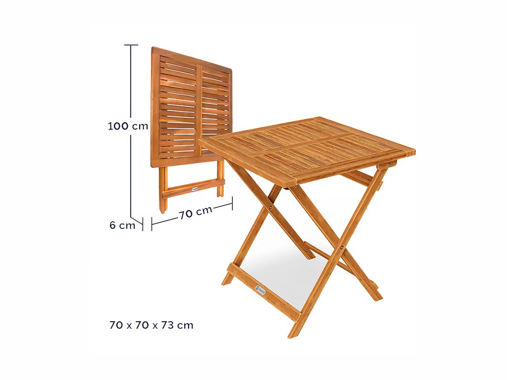 Az összecsukható faasztal méretei: 70 × 70 × 73 cm