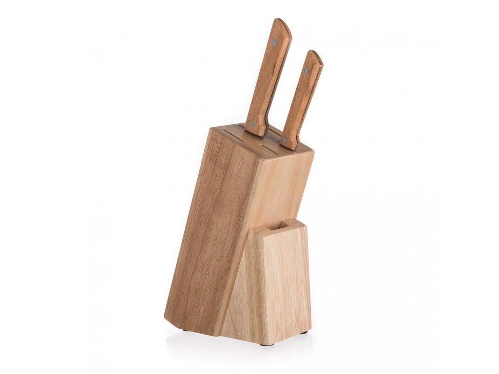 A fából készült tárolóban 5 kés és egy olló fér el. Praktikus csúszásmentes lábakkal rendelkezik az extra stabilitás érdekében.