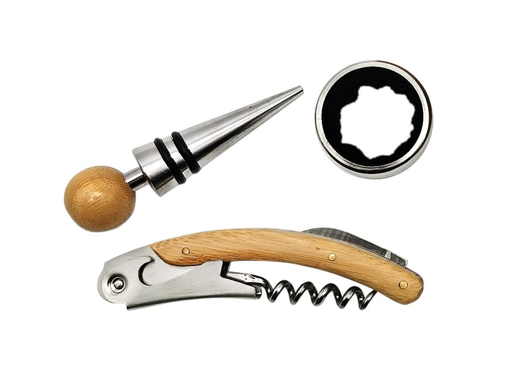 Az eredeti háromrészes ajándékkészlet egy fadobozban, amely mindent tartalmaz, amire szüksége lenne a bor élvezéséhez.