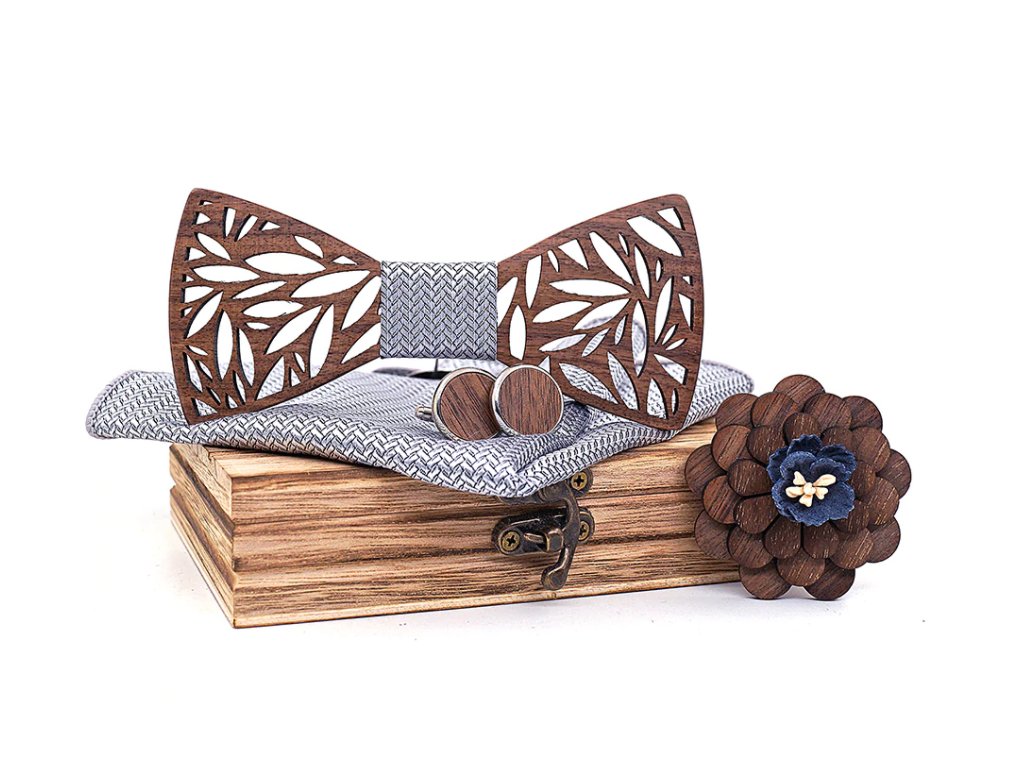 A nyers fából készült, újszerű kialakítású fa csokornyakkendő minden úriember ruhatárában jól fog mutatni.
