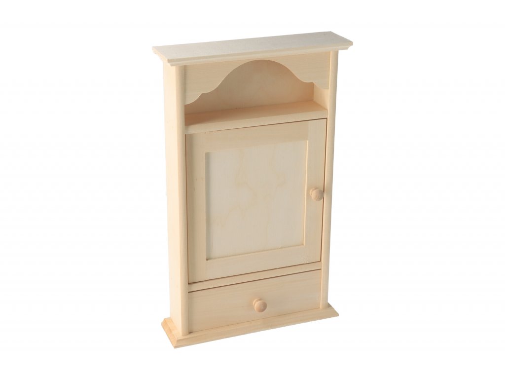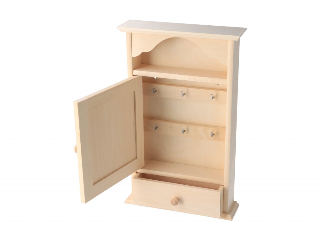 A szekrény borovifenyőből készült, és a belsejében 6 fémhorgot talál, amelyek a kulcsok felakasztására szolgálnak. Az alján egy kis fiók található, ahová minden szükséges apróságot elrejthet.