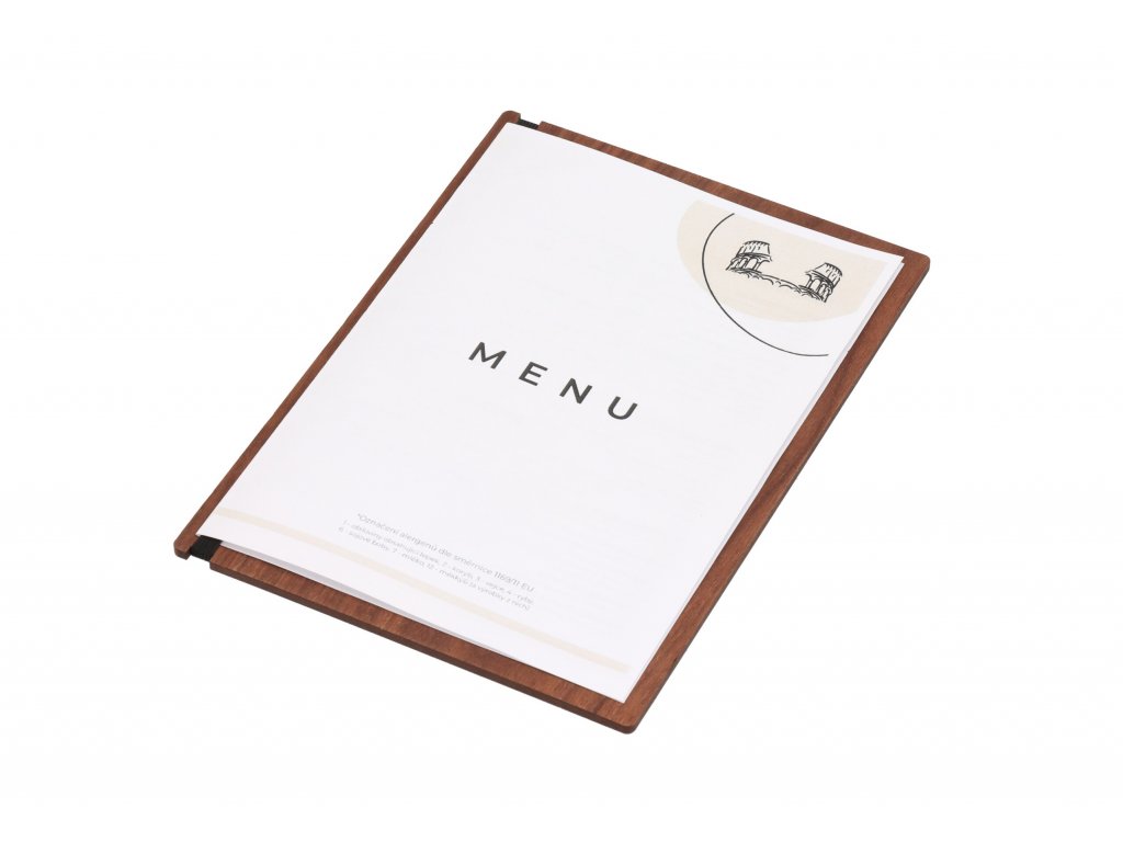 Eredeti, amerikai diófából készült A5-ös fából készült étlap, amely nagyszerű kiegészítője lesz egy étteremnek vagy kávézónak. Egyszerűen nyomtassa ki az étlapot, és helyezze be a szoros gumi mögé.