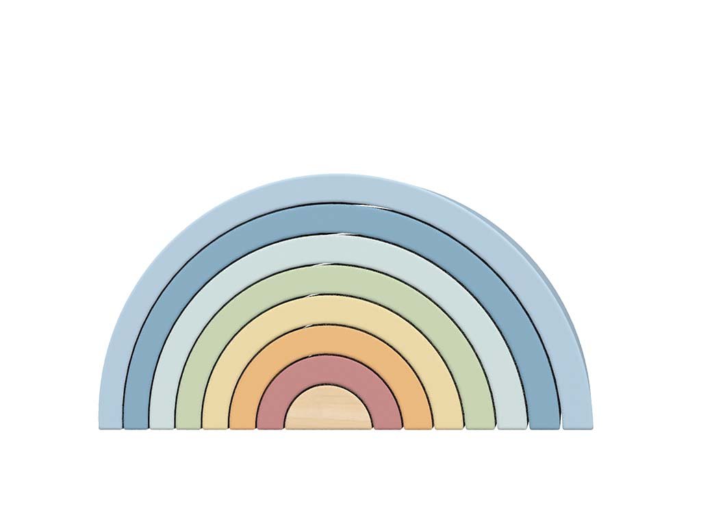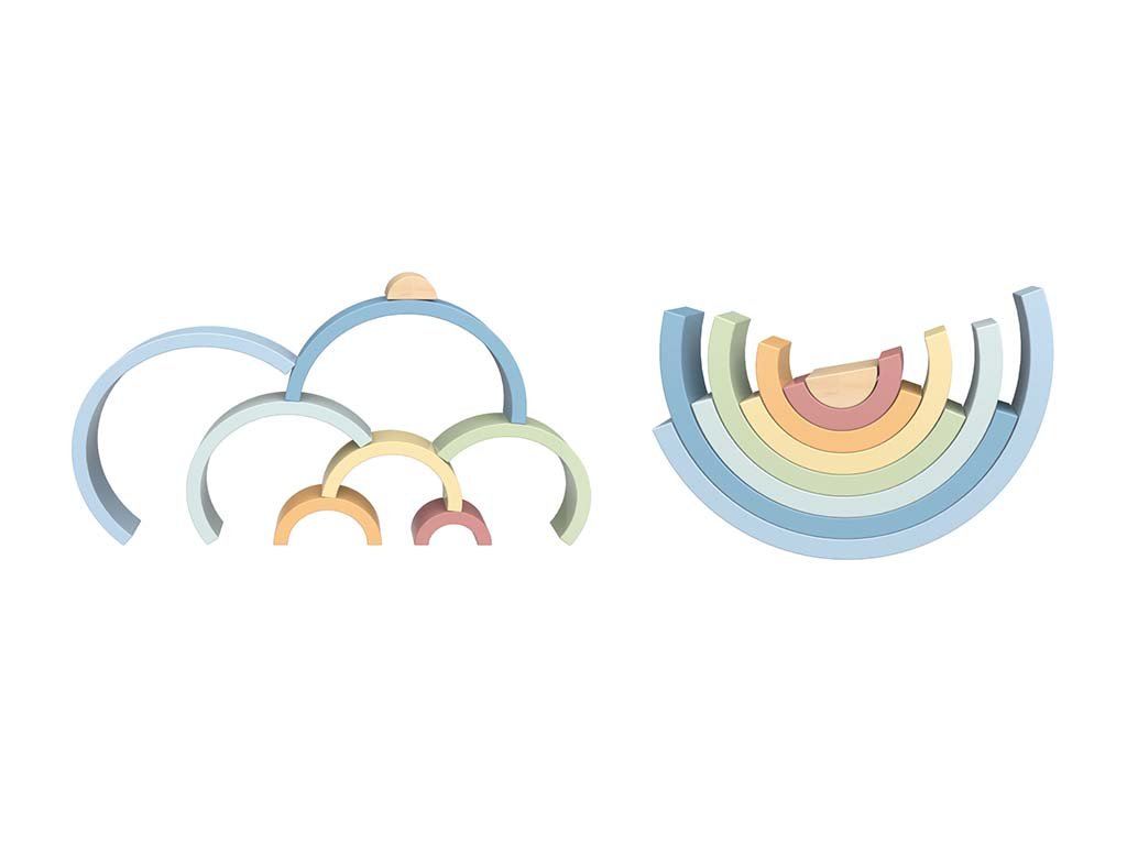 A pasztellszínű, összecsukható, fából készült szivárvány játékosan serkenti a gyermekek képzeletét és finommotoros készségeit. A gyerekek kreativitásukat felhasználva boltíveket építhetnek, új formákat hozhatnak létre, vagy hidakat és alagutakat készíthetnek a szivárványból fa autóknak.