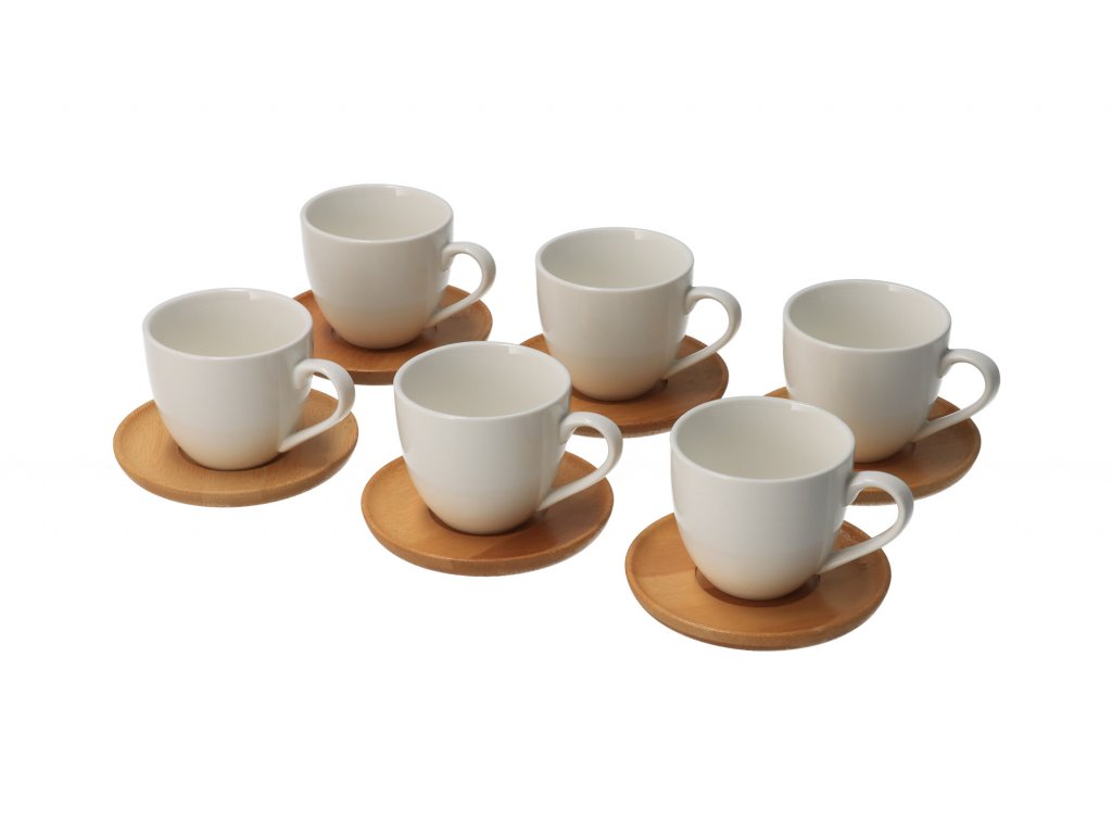 Bambuszból készült fa alátét porcelán csészével. A készlet 6 szettet tartalmaz (alátét és bögre).