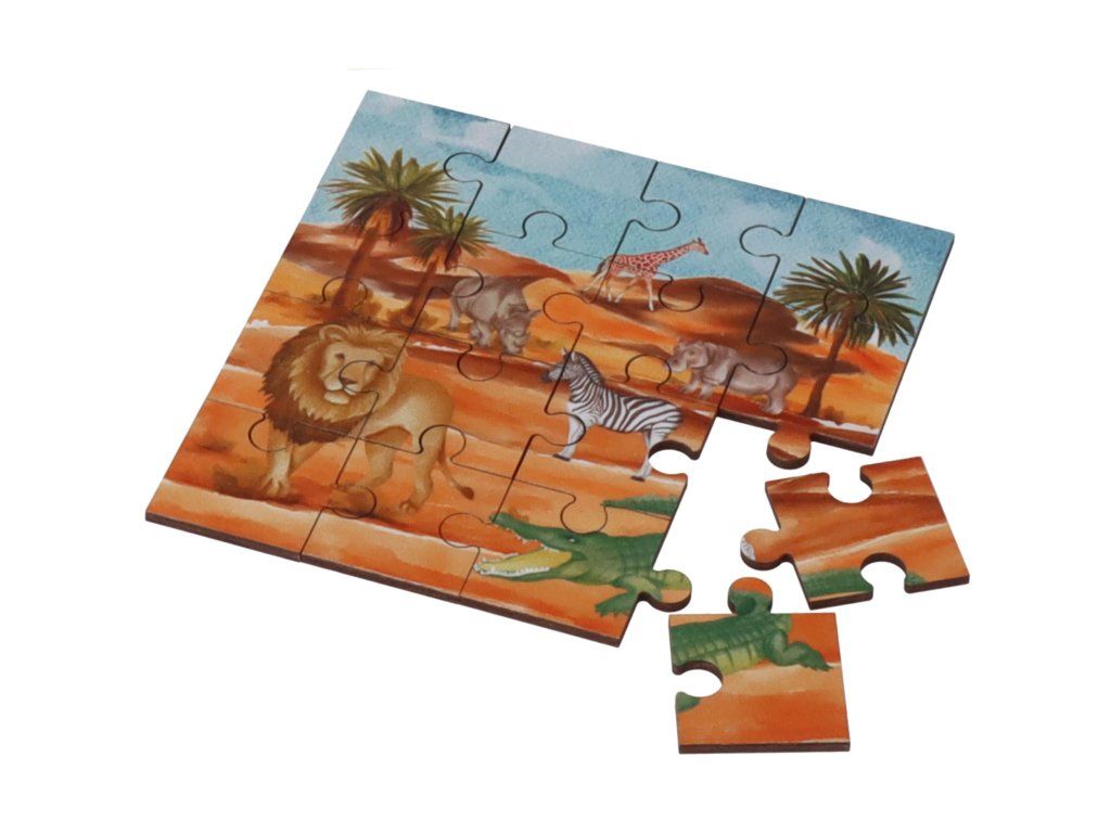 Az afrikai állatokat ábrázoló színes puzzle minden korosztály számára örömet szerez. A fa darabok összeillesztése segíti a finommotorika, a logikus gondolkodás, valamint a türelem és az együttműködés fejlesztését.