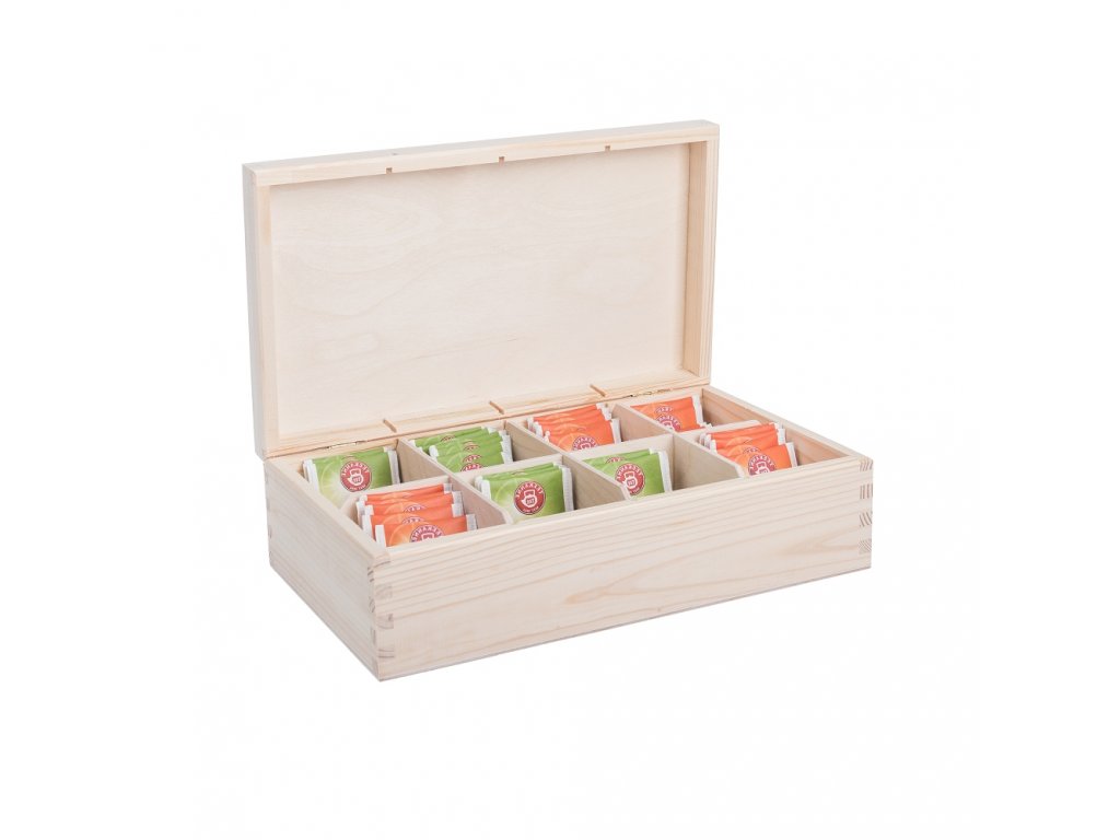 A doboz eredeti ajándékként is tetszeni fog a tea szerelmeseinek. Borovi borovifenyőből készült, 8 rekesszel rendelkezik, és minden rekesz mérete 6,5 x 7 cm.