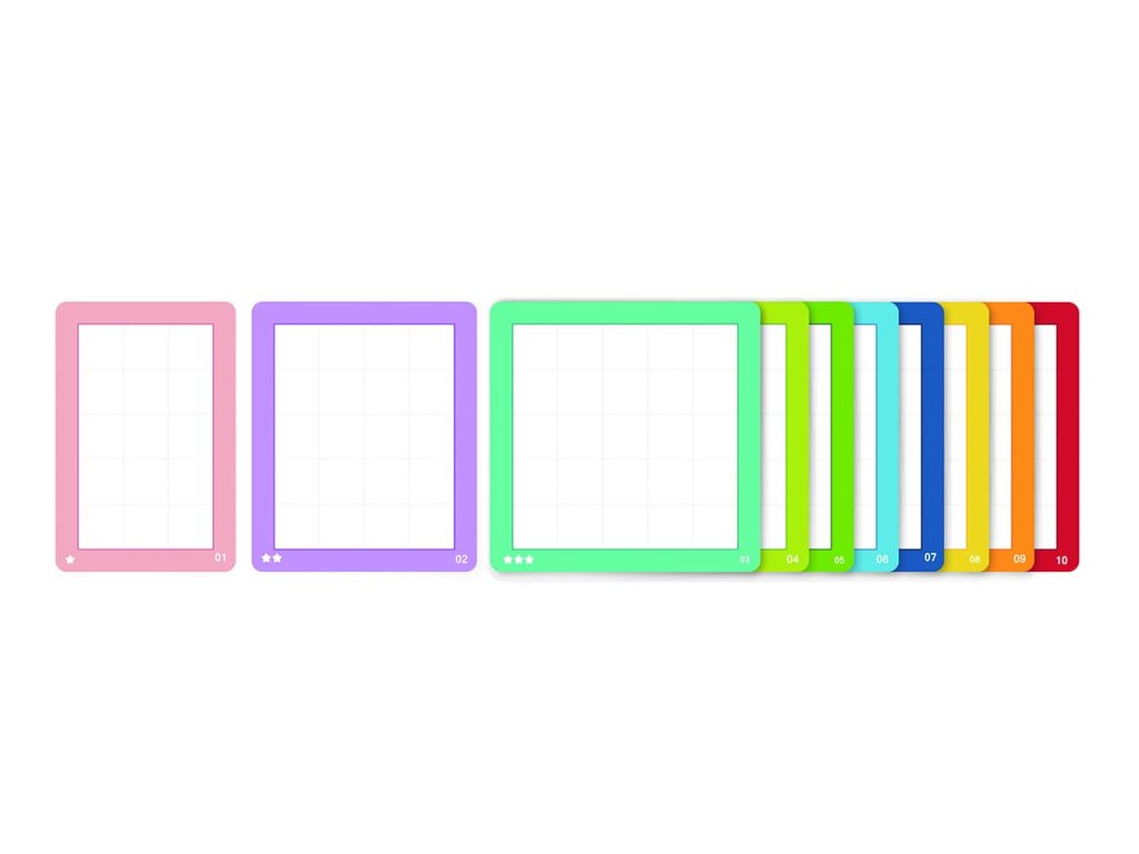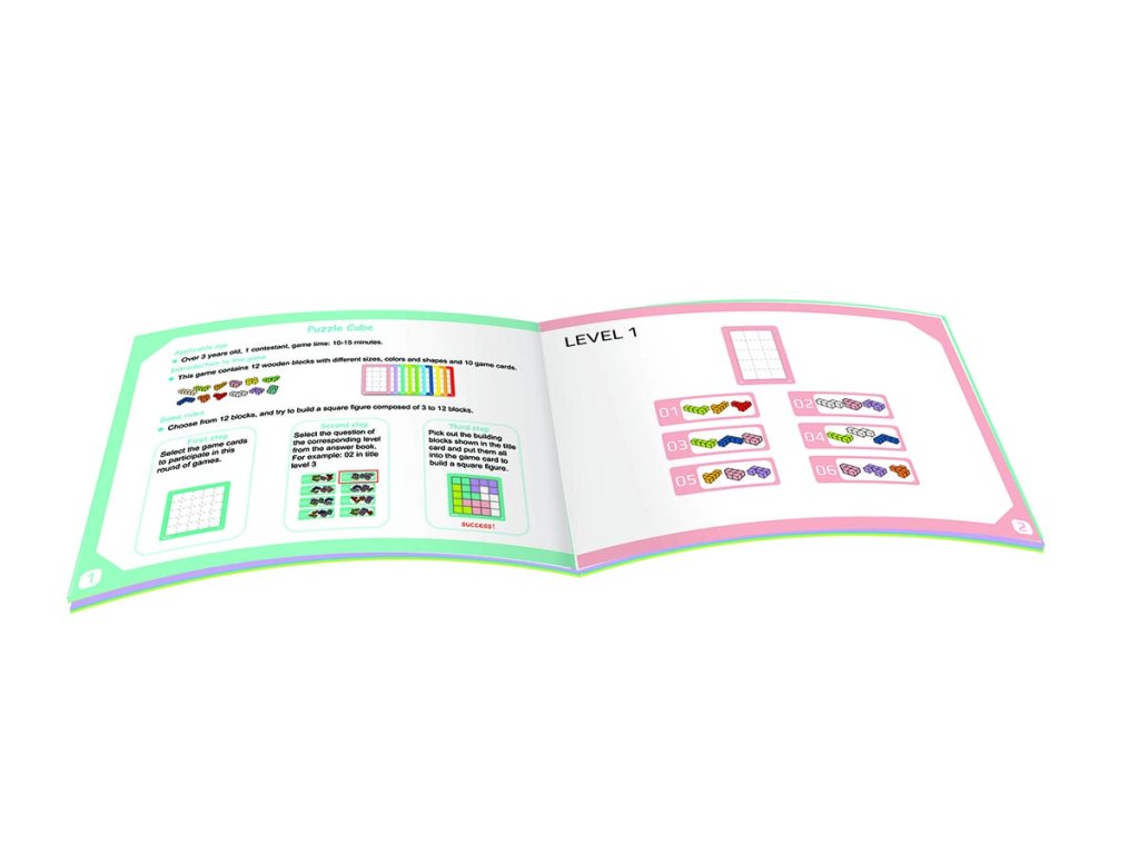 Alkalmas otthoni játékra, valamint óvodában vagy napközis foglalkozásokon is. A készlet 12 színes kockát és 10 nehézségi szintet tartalmaz.