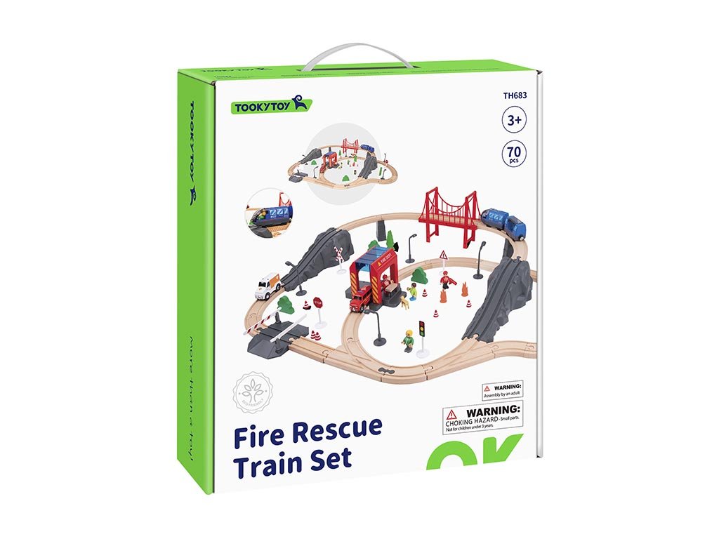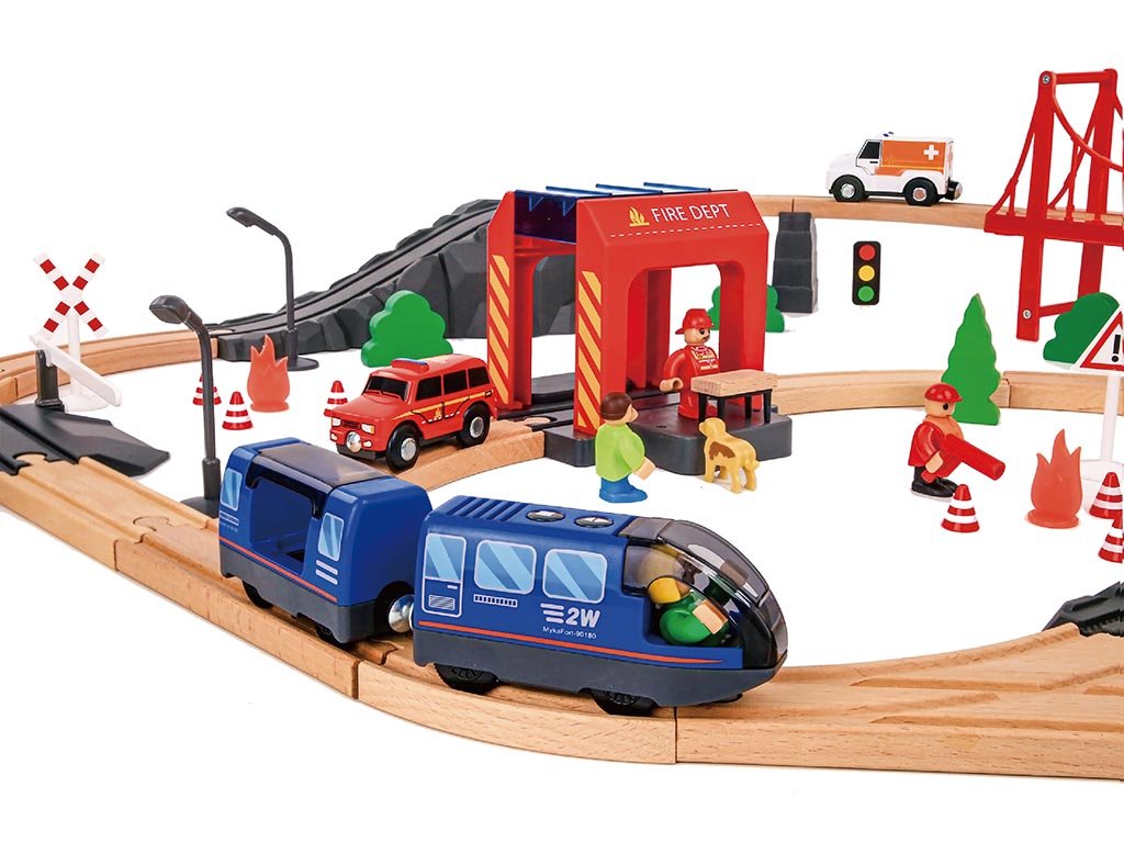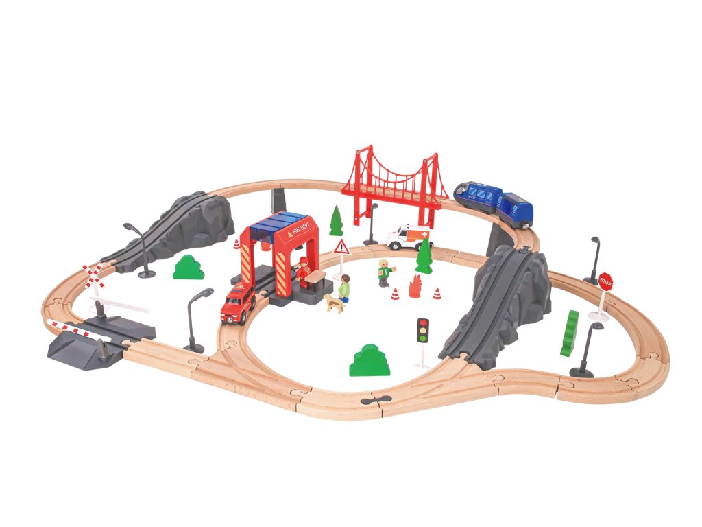 A fa vonatkészlet 70 darabból áll, amelyek összeillesztve egyedi kalandvilágot teremtenek. A készlet tartalmaz egy tűzoltóautót, egy mentőautót, egy tűzoltófigurát, közlekedési táblákat, vasúti lámpákat, fákat, bokrokat és számos egyéb kiegészítőt. Ezeknek köszönhetően a gyerekek saját történeteket és mentési forgatókönyveket alkothatnak, amelyek fejlesztik a képzelőerejüket és a kreativitásukat.