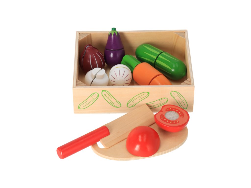 Színes zöldségekkel teli fadoboz, amelyet a gyerekek felvagdoshatnak, majd tépőzárral újra összeilleszthetnek. A készlet tartalmaz egy fakést és egy vágódeszkát.