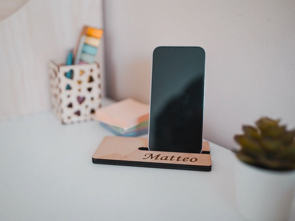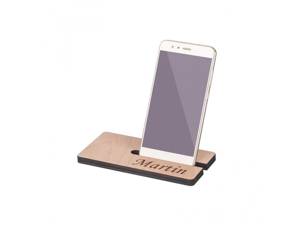 Fából készült mobilállvány furattal. Kérésre az Ön által választott nevet gravírozunk erre a tartóra.