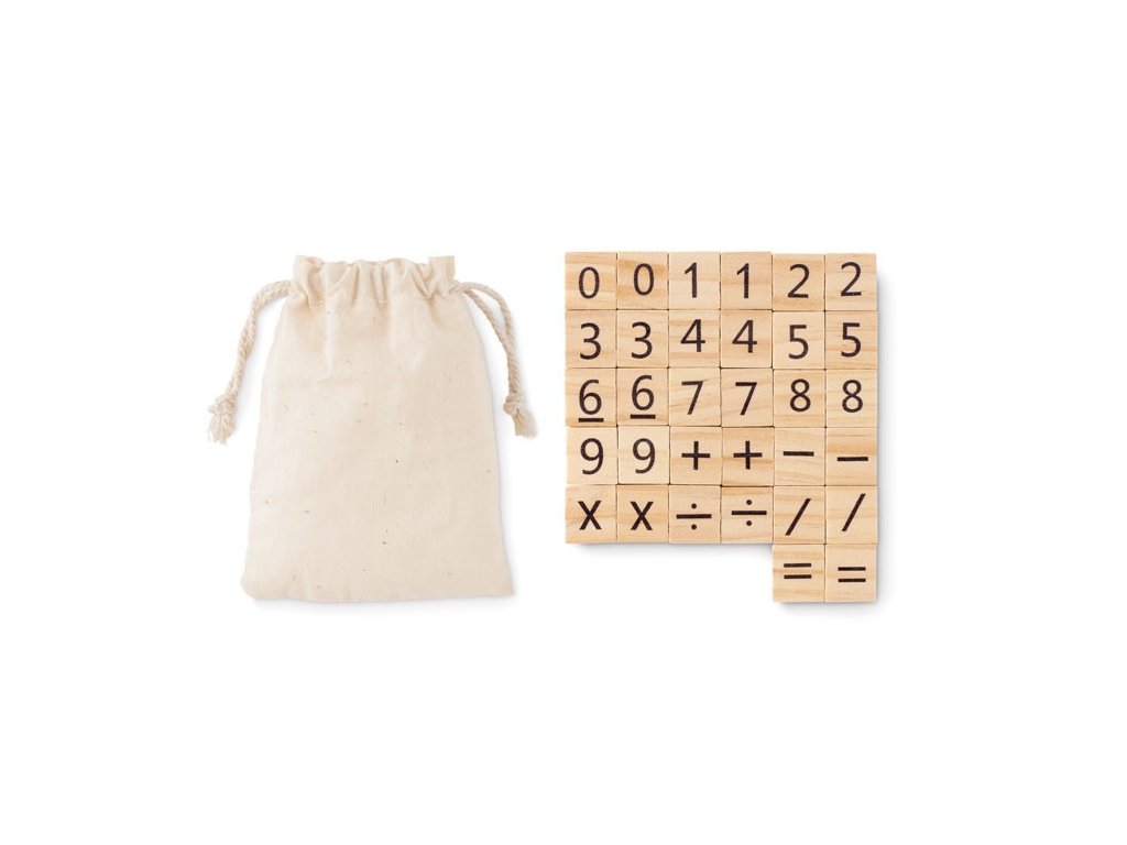 A készlet két 0 és 9 közötti számot és a + - × ÷ = /. matematikai szimbólumokat tartalmazza. Az 1,8 x 2 x 0,5 cm-es kockák a legfinomabb bükkfából készültek, és pamutzsákban vannak tárolva.