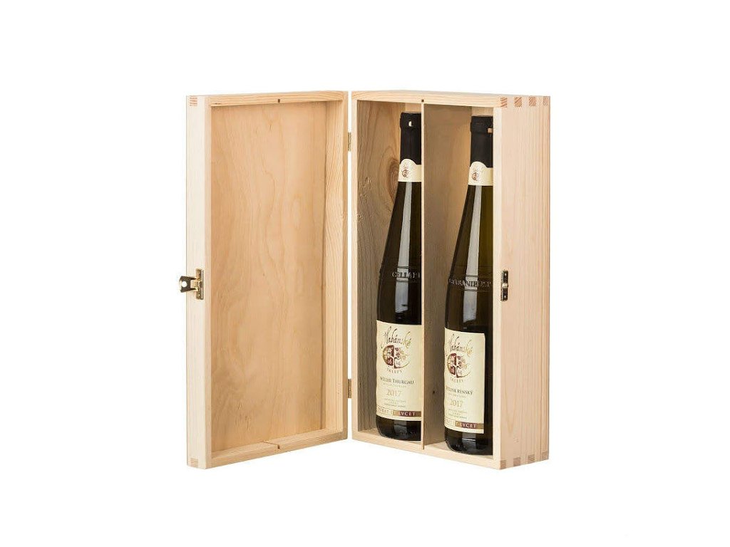 A nagyon szépen megmunkált borosdoboz borovifenyőfából készült, és belül két rekeszre van osztva. A rekeszek száma jelzi, hogy hány borosüveg fér el benne.