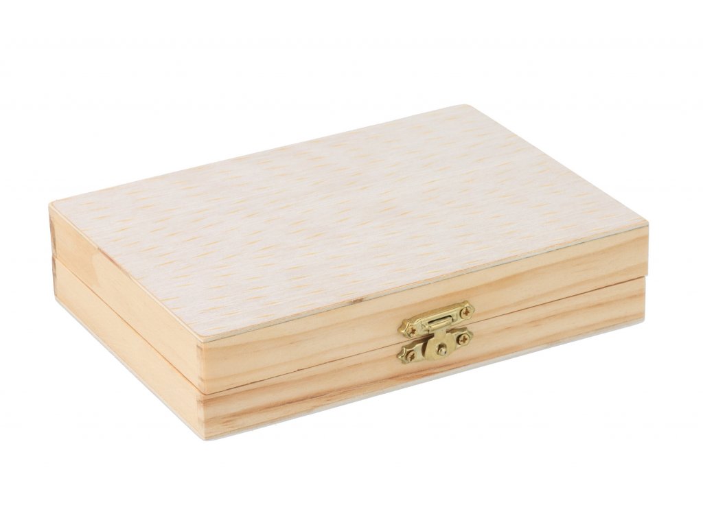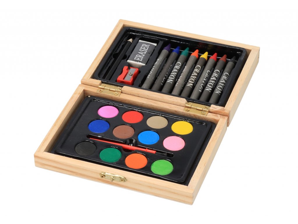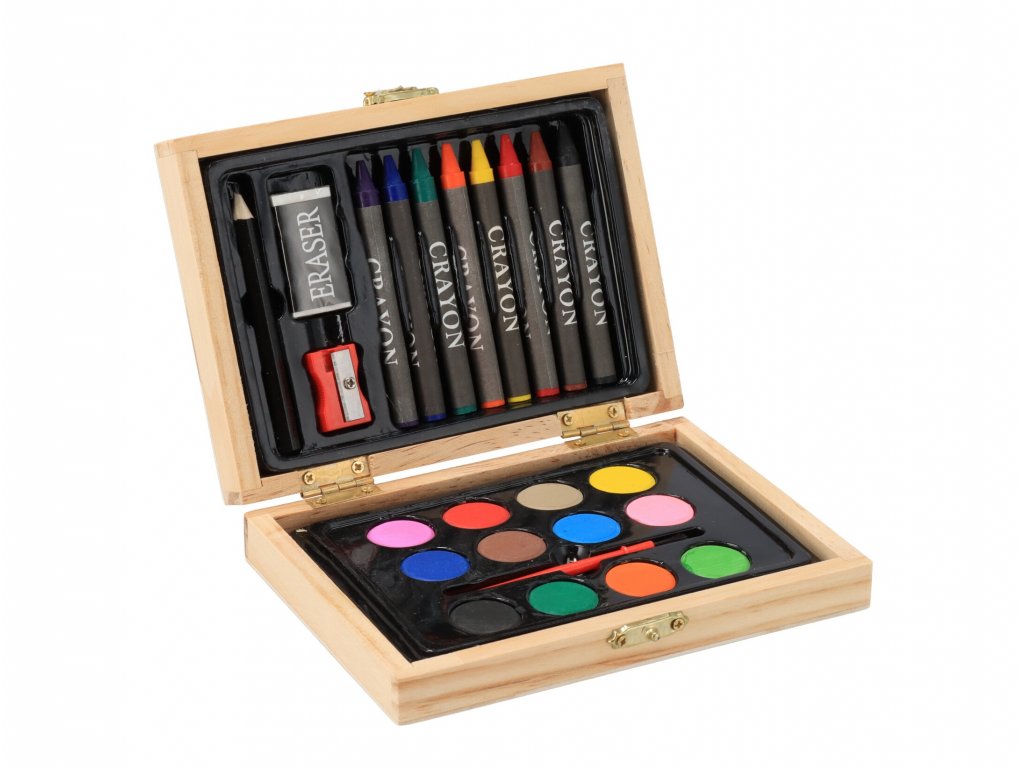 8 viaszkréta, 12 vízfesték, ecset, ceruza, hegyező és radír, mindez ebben a fadobozban.