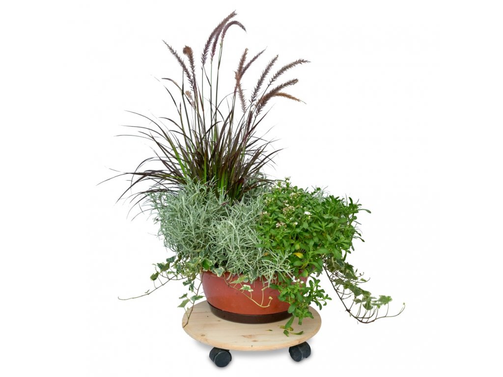 Kerek fa alátét virágoknak kerekekkel, melyek segítségével könnyen változtathatja helyüket.