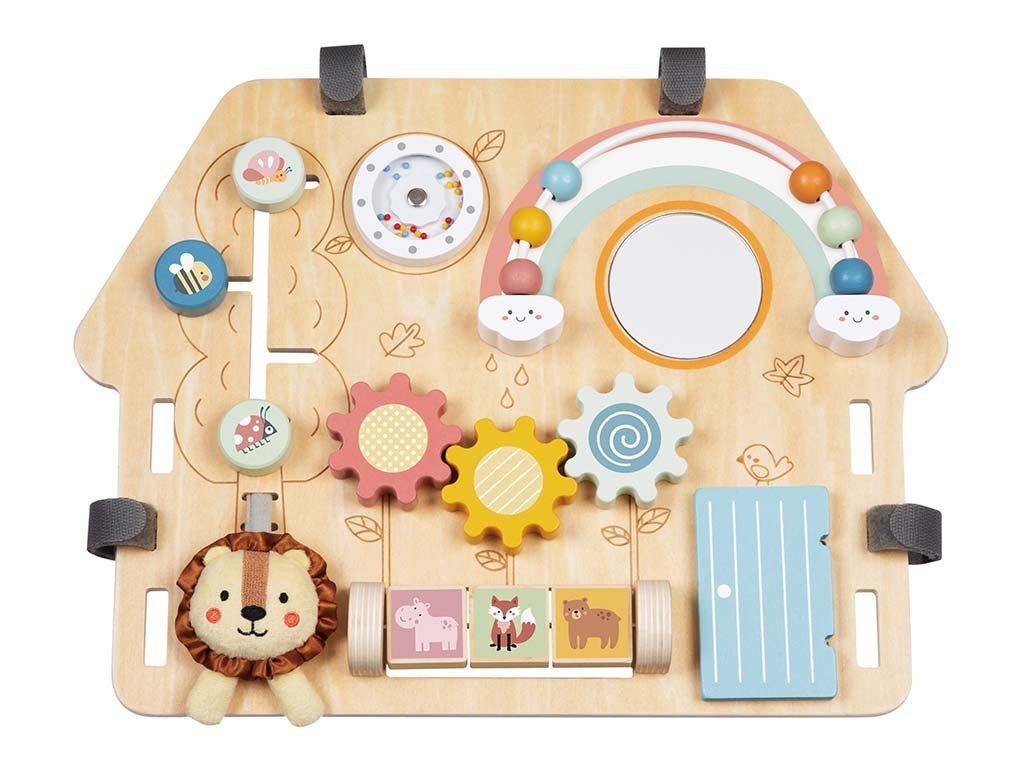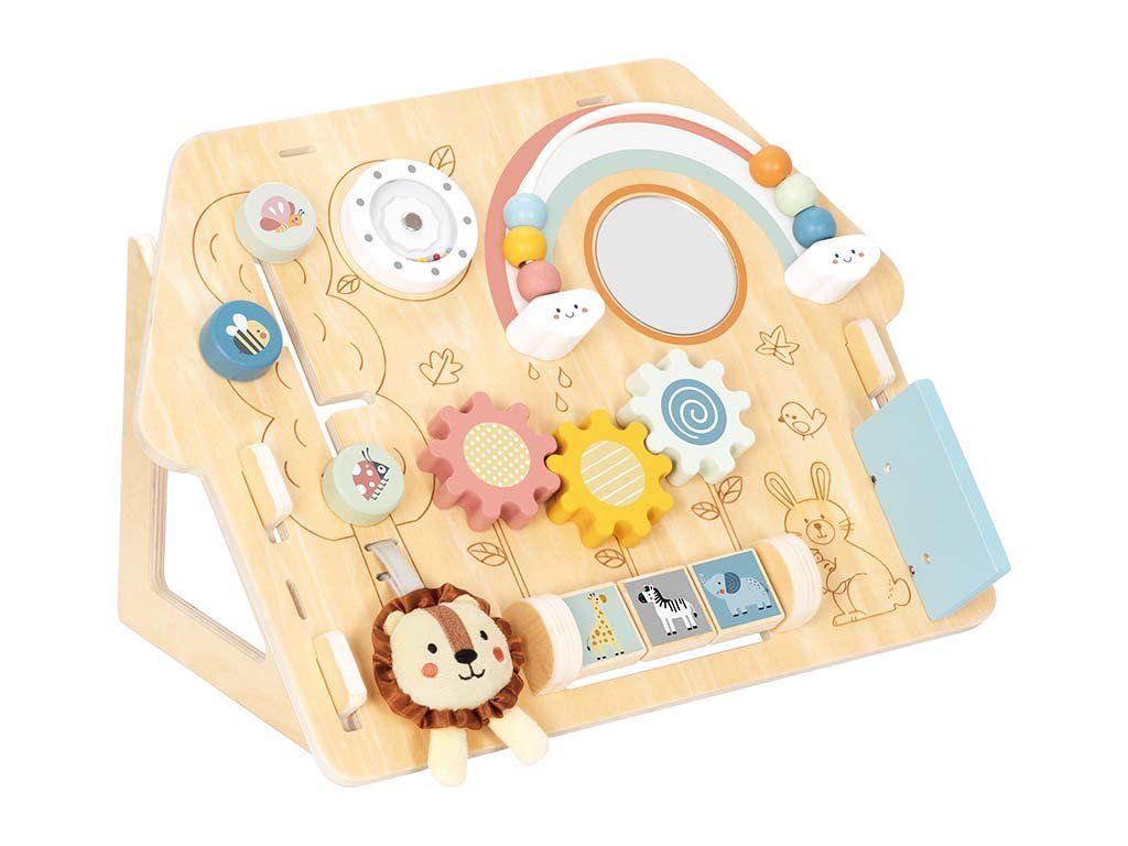 Ez a fabol készült interaktív tábla teľa van tevékenységekkel, és a gyerekek számara örömet okoz a felfedezésben és a jatékos tanulásban. Forgó fogaskerekeket, szivárványpályán elhelyezett gyöngyöket, egy kis tükröt, mozgó elemeket és egy púha oroszlánt tartalmaz, amely tapintásra csábítja őket. Minden részlet a finommotoros készségek a kéz-szem koordináció a logikus gondolkodás és az érzékszervi érzékelés fejlesztését szolgálja.
