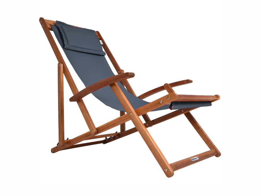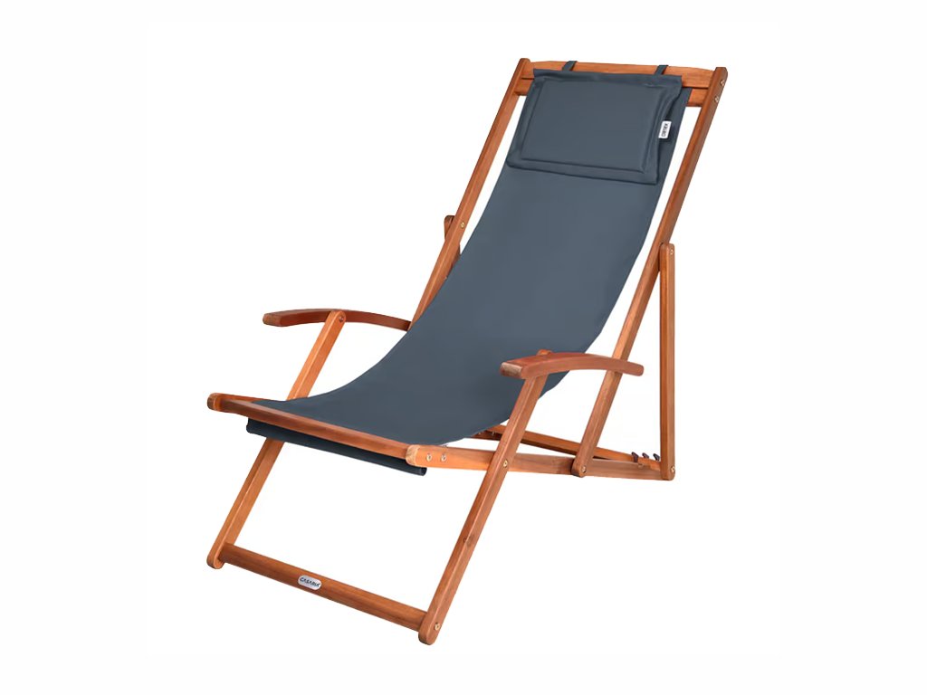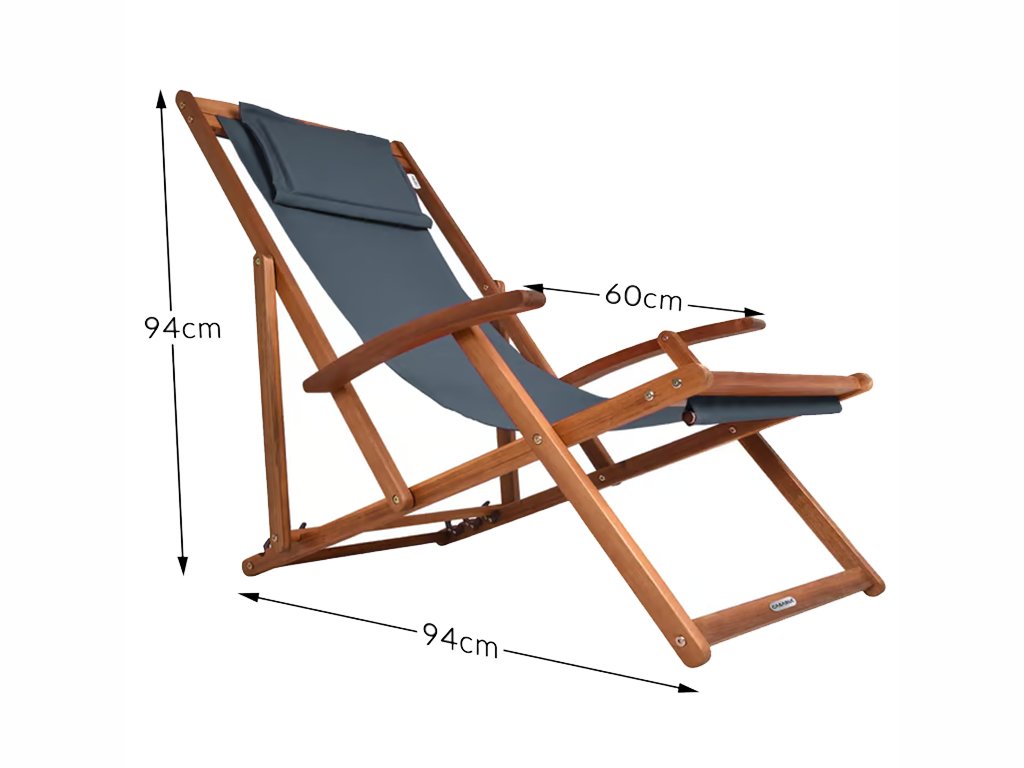 A nyugágy 3 pozícióba állítható és könnyen összecsukható, így könnyen szállítható és tárolható. A kényelmet a karfák és a kivehető, tépőzáras, párnázott fejpárna biztosítja. A légáteresztő anyag alkalmazkodik a testhez, és megakadályozza az izzadást még hosszabb használat során is.