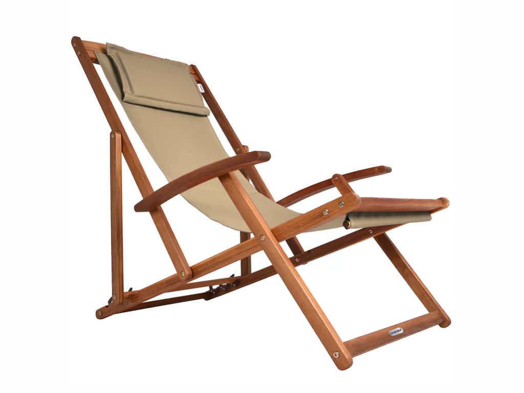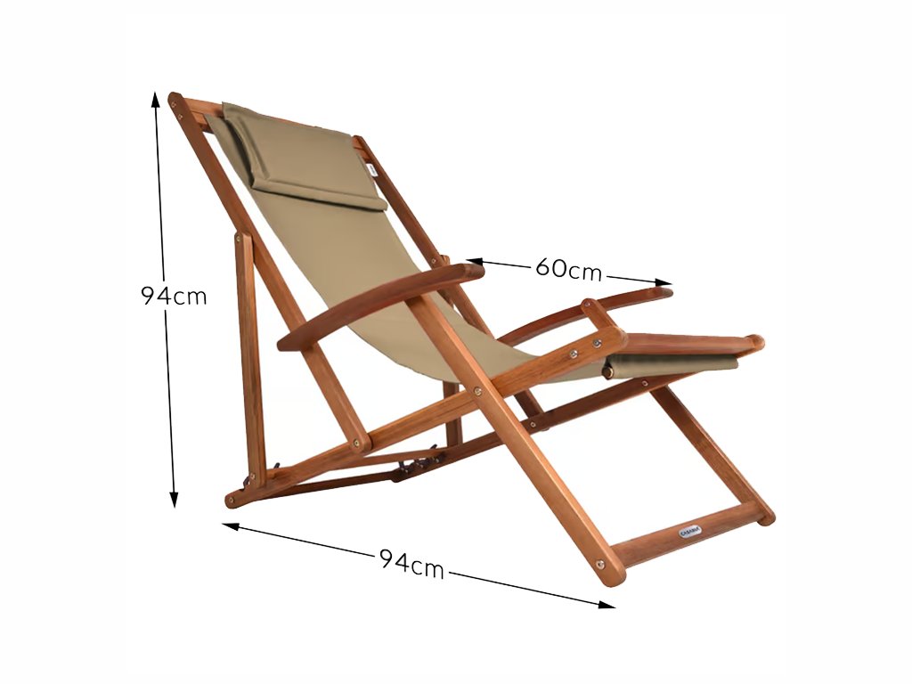 A nyugágy 3 pozícióba állítható és könnyen összecsukható, így könnyen szállítható és tárolható. A kényelmet a karfák és a kivehető, tépőzáras, párnázott fejpárna biztosítja. A légáteresztő anyag alkalmazkodik a testhez, és megakadályozza az izzadást még hosszabb használat során is.