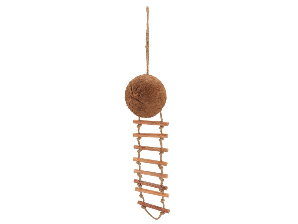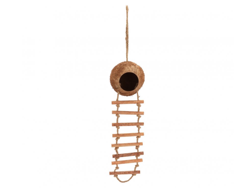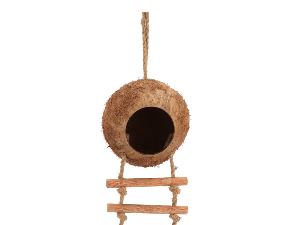 A létrával ellátott kókuszdió házikóban a madarak és kis rágcsálók megpihenhetnek, játszhatnak és biztonságban érezhetik magukat.