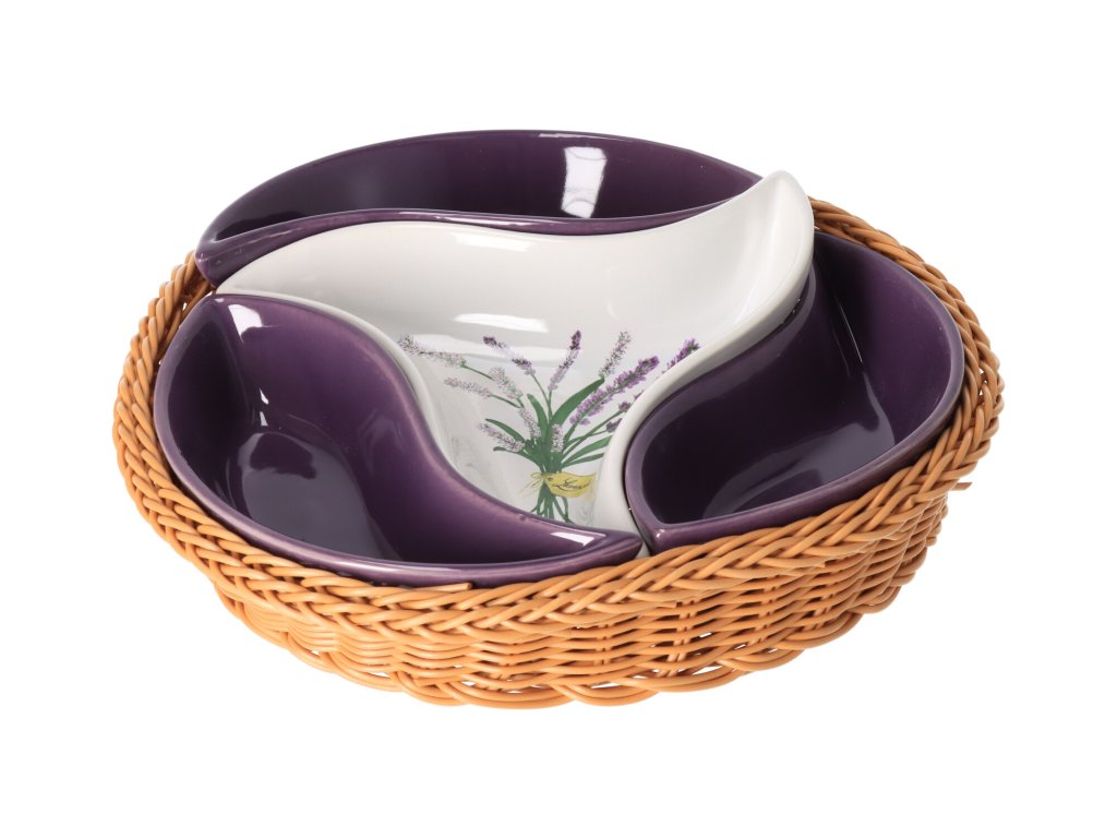 Stílusos négyrészes LAVENDER tálkészlet fonott kosárban. Alkalmas sós és édes ételek tálalásához.