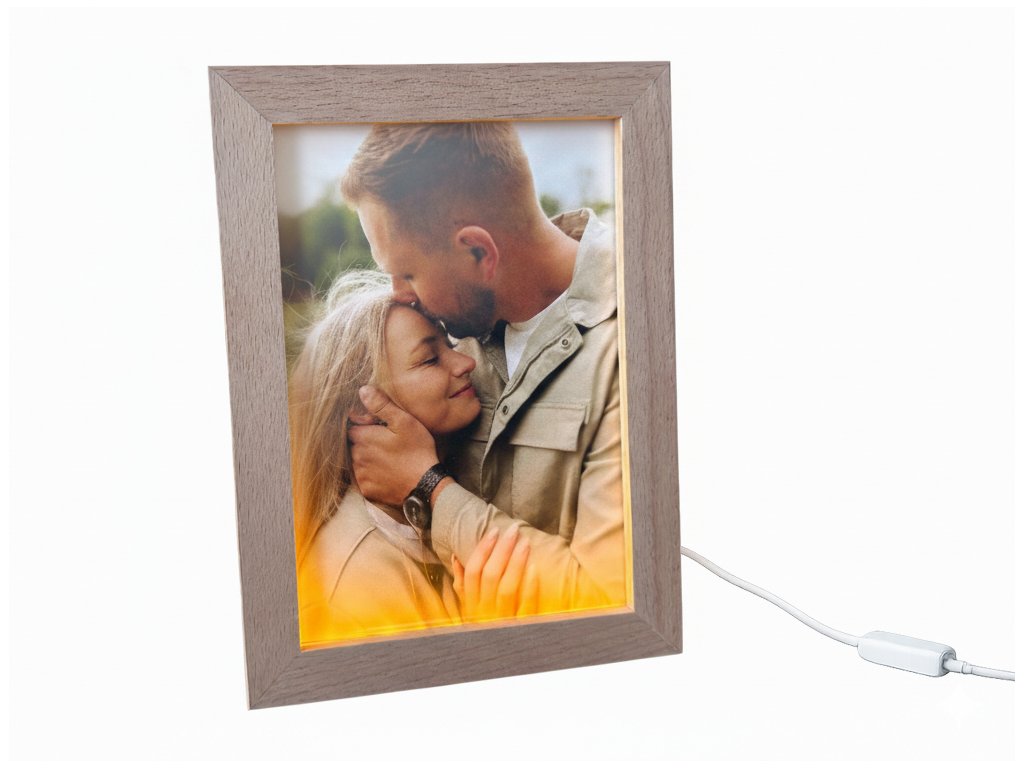 Ajándékozzon ragyogó emlékeket! Egy akrilüvegre helyezett, saját fotójával díszített fa keret LED-fénnyel világítja meg fotóit. Tökéletes ajándék Valentin-napra, esküvőre vagy évfordulóra, meghitt és romantikus hangulatot teremtve a hálószobában, a nappaliban vagy az irodában.
