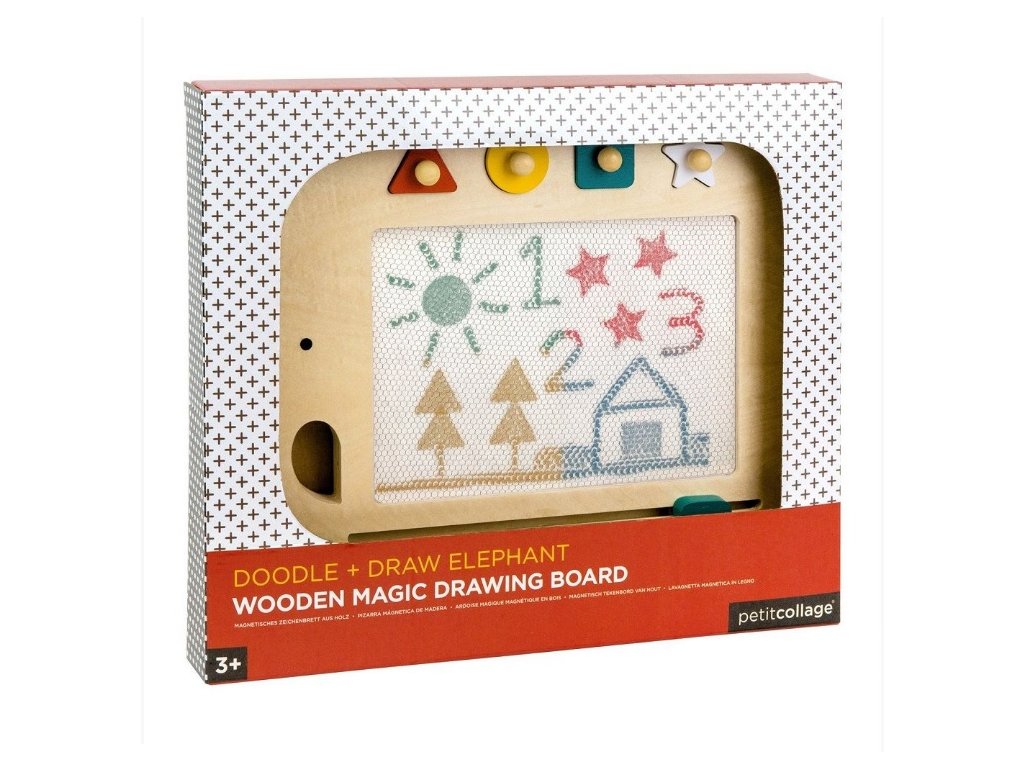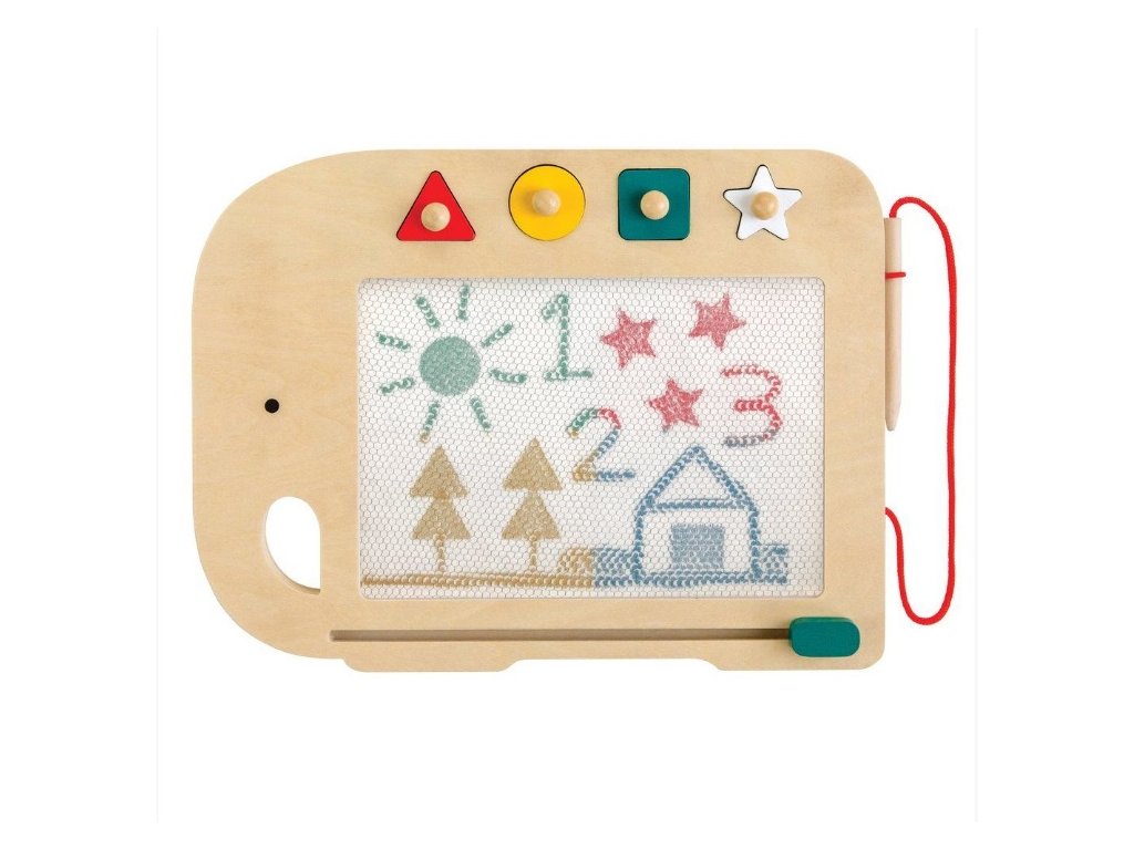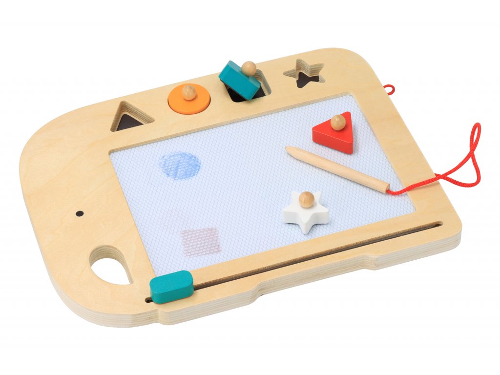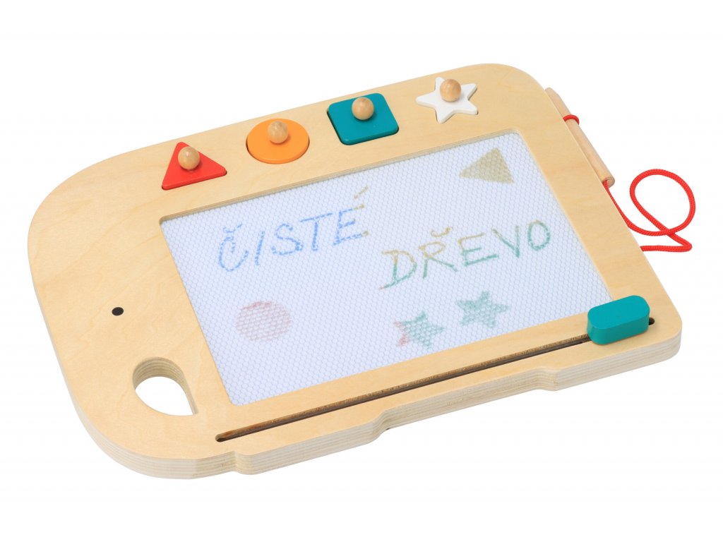 Gyönyörű, fából készült mágneses rajztábla. A gyermek a zsinórhoz szilárdan rögzített ceruzával írhat vagy rajzolhat, és a négy, különböző alakú mágneses bélyegzővel pedig mintákat és formákat hozhat létre.