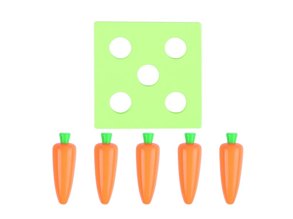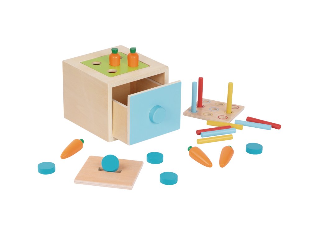 A Montessori kocka négy szórakoztató tevékenységet kínál, amelyek támogatják a gyermekek finommotoros készségeinek, logikus gondolkodásának és kíváncsiságának fejlődését. A kocka minden oldala más feladatot kínál - formák beillesztését, színes rudak válogatását, sárgarépa „szedését” és labdadobást.
