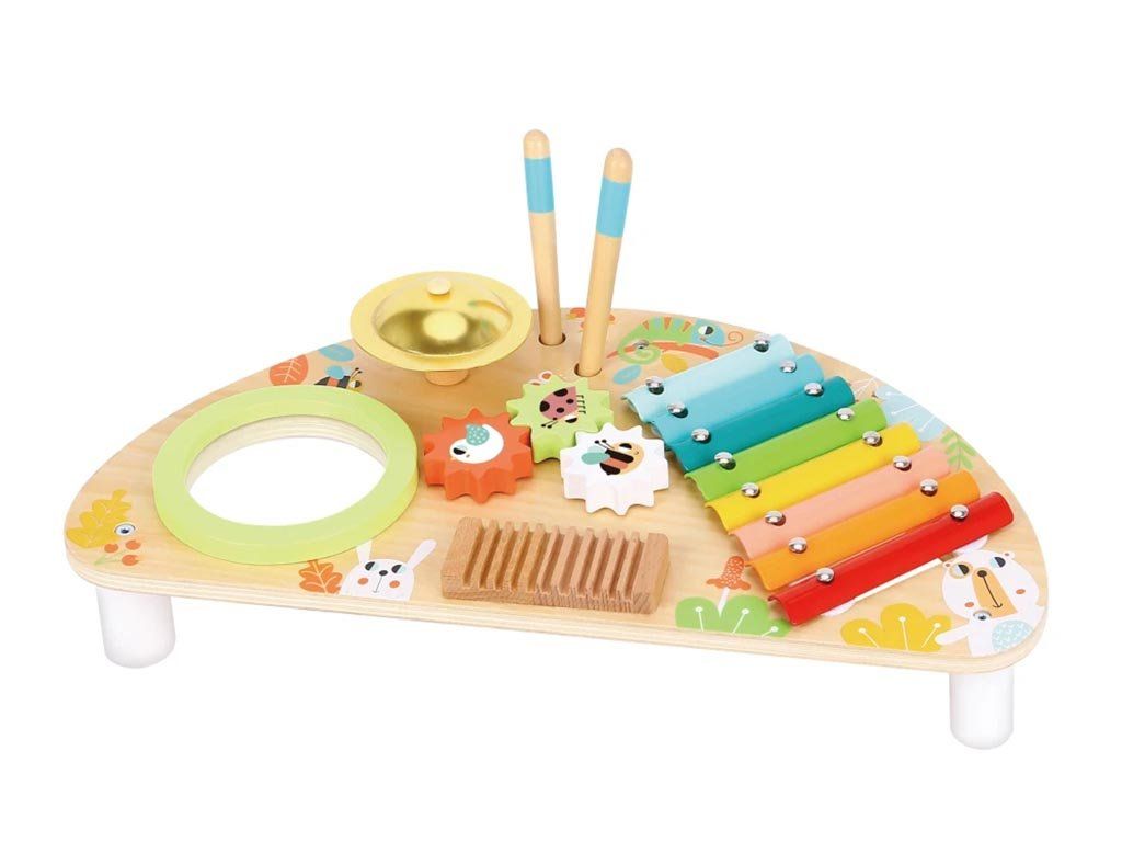 A zenei központ különféle hangszereket tartalmaz, például xilofont, dobot és cintányérokat, amelyek segítségével a gyerekek kísérletezhetnek a hangokkal és felfedezhetik azok kombinációit. A készlet kalapácsokat is tartalmaz, amelyekkel még több játéklehetőséget próbálhatnak ki.