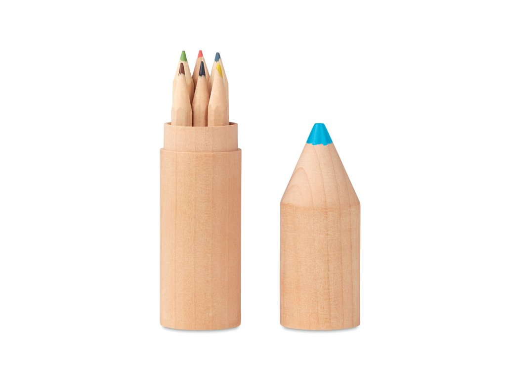 Sada obsahuje 6 barevných pastelek uložených v originální dřevěné krabičce ve tvaru pastelky.